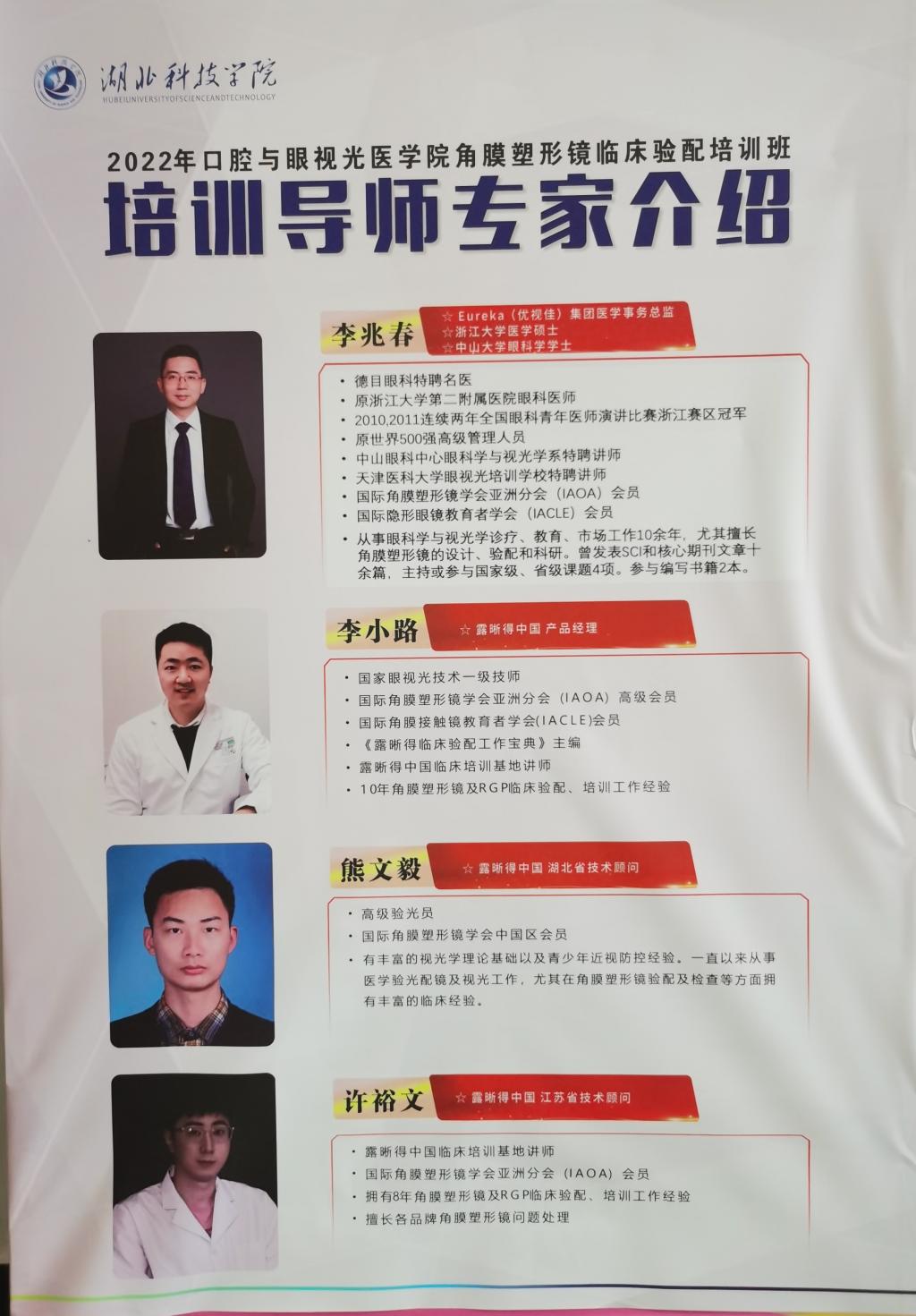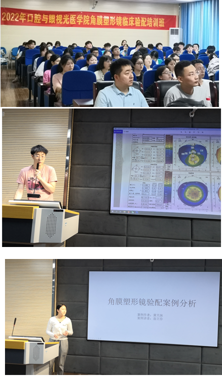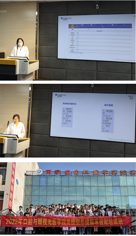 培训班邀请了有着丰富临床验配经验的优视佳集团医学事务总监李兆春,露晰得中国产品经理李小路、湖北省技术顾问熊文毅、江苏省技术顾问许裕文四位老师共同承担授课内容,beat36518级五年制眼视光医学专业73名同学参加此次培训。课程设置包括如何看懂角膜地形图;硬性角膜接触镜初阶知识;RGP的设计及标准验配;角膜塑形镜的设计及标准验配;角膜塑形镜配适常见问题及参数调整等,老师们深入讲解,互动答疑,对同学们进行了系统性的培训。在学习了角膜塑形镜的验配技巧后,同学们分组实操露晰得角膜塑形镜验配,从选镜片到看染色,再到分析讨论试戴检查结果,多角度学习角膜塑形镜验配,进一步梳理和巩固了知识体系,大家都纷纷表示收获颇丰,期待再次相聚。