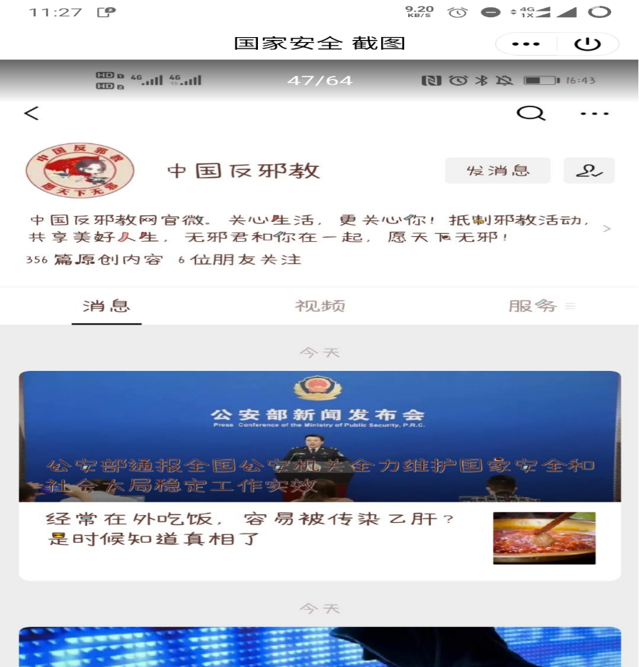 六、开展“反邪教警示教育进校园”活动。要求各班学生关注“中国反邪教”官网和微信公众号,积极参与线上警示教育项目,提高师生防范邪教意识和能力。
