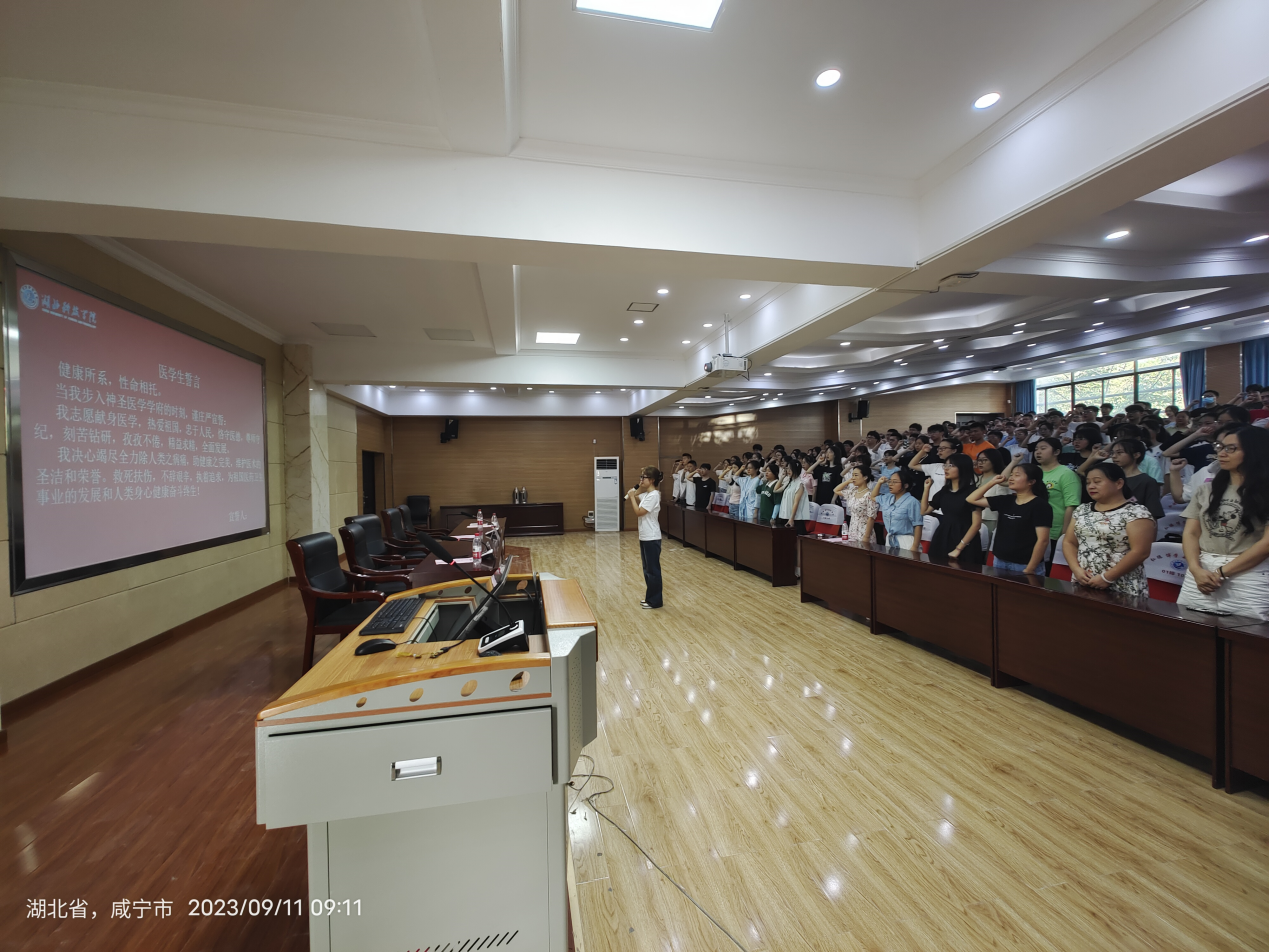 开学典礼上,伴随着李雨婕同学的领誓,健康所系,性命相托”“我决心竭尽全力除人类之病痛,助健康之完美,维护医术的圣洁和荣誉铿锵有力的誓词声环绕在教室内。