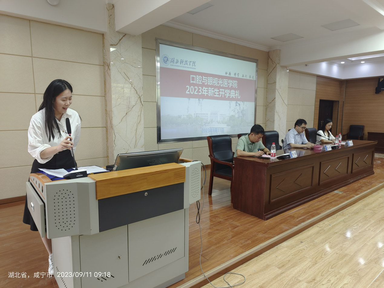 口腔专业教师冯蕊作为教师代表发言。希望同学们塑身心健康、坚韧于心。她寄语新生,在今后从医的道路上坚守内心的纯净与温度,满怀真诚播撒良善,以自己的行动诠释医者仁心的内涵。