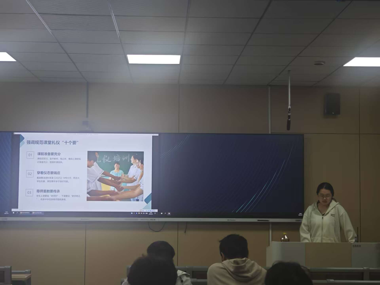 班会最后,班主任对本次主题班会进行了总结,课堂礼仪与课堂纪律的遵守是内在自律的选择,学校还有一系列制度措施,如查考勤、辅导员听课等,通过外在的刚性约束,保障高质量学风逐渐养成,助力同学们成长发展。
