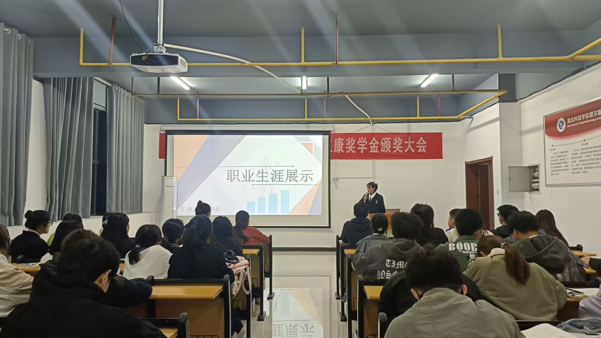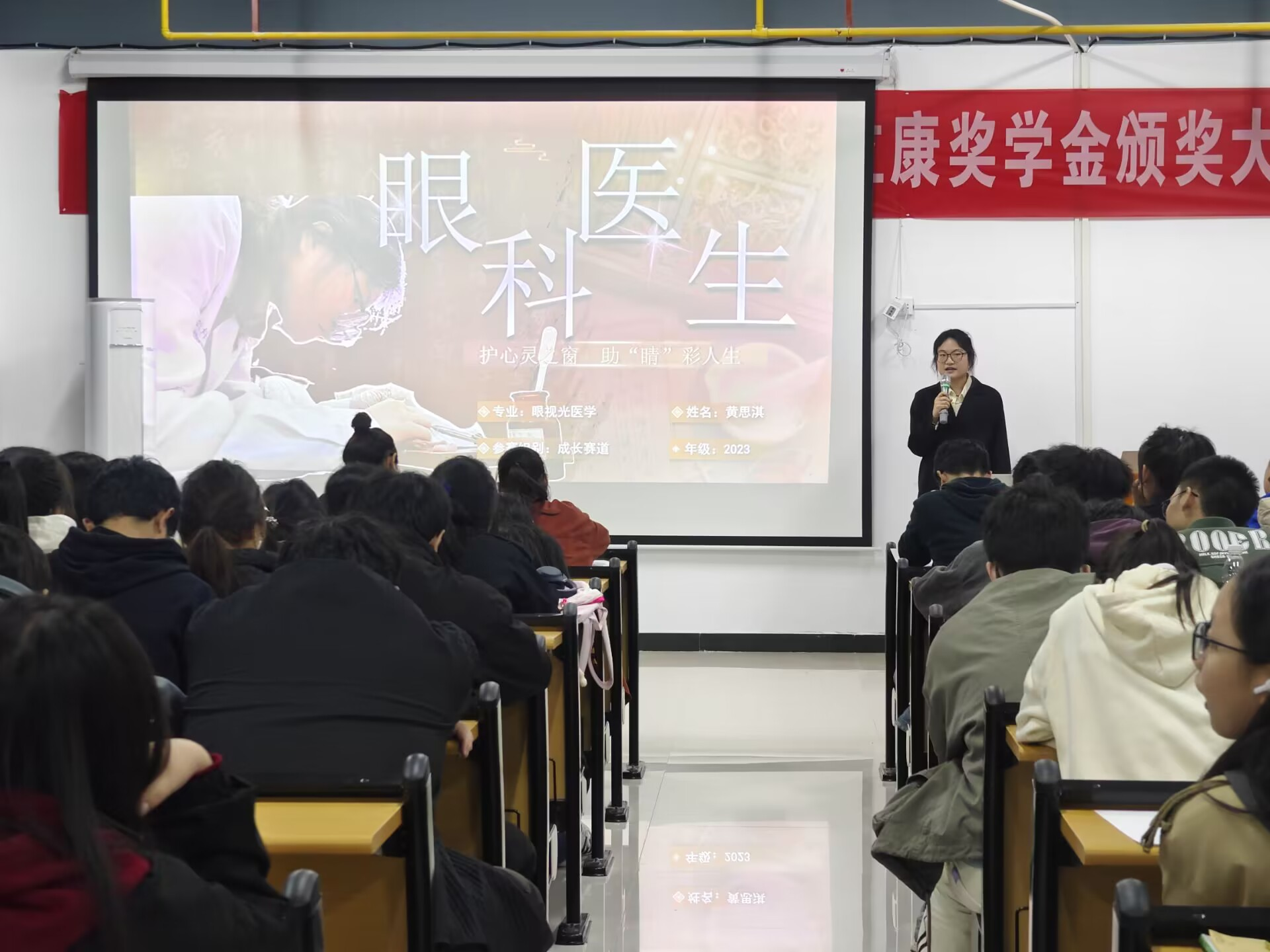 在展示环节,同学们围绕职业价值观、市场需求、个人兴趣、专业特色等方面生动讲述了自己的生涯规划与实践历程,将个人梦想与医疗卫生事业发展有机融合,职业目标合理、发展路径清晰,充分展现了医学生的责任与担当。其中,黄思淇同学充分发挥对眼视光专业的热爱,结合自身的特点,致力于成为一名让人重见光明的眼科医生。王章秀同学想要成为口腔医学专业的创业者,投身于乡村振兴大局,为家乡人民牙健康作出个人贡献,并在专业学习、创新创业等方面展现出突出的综合素养。