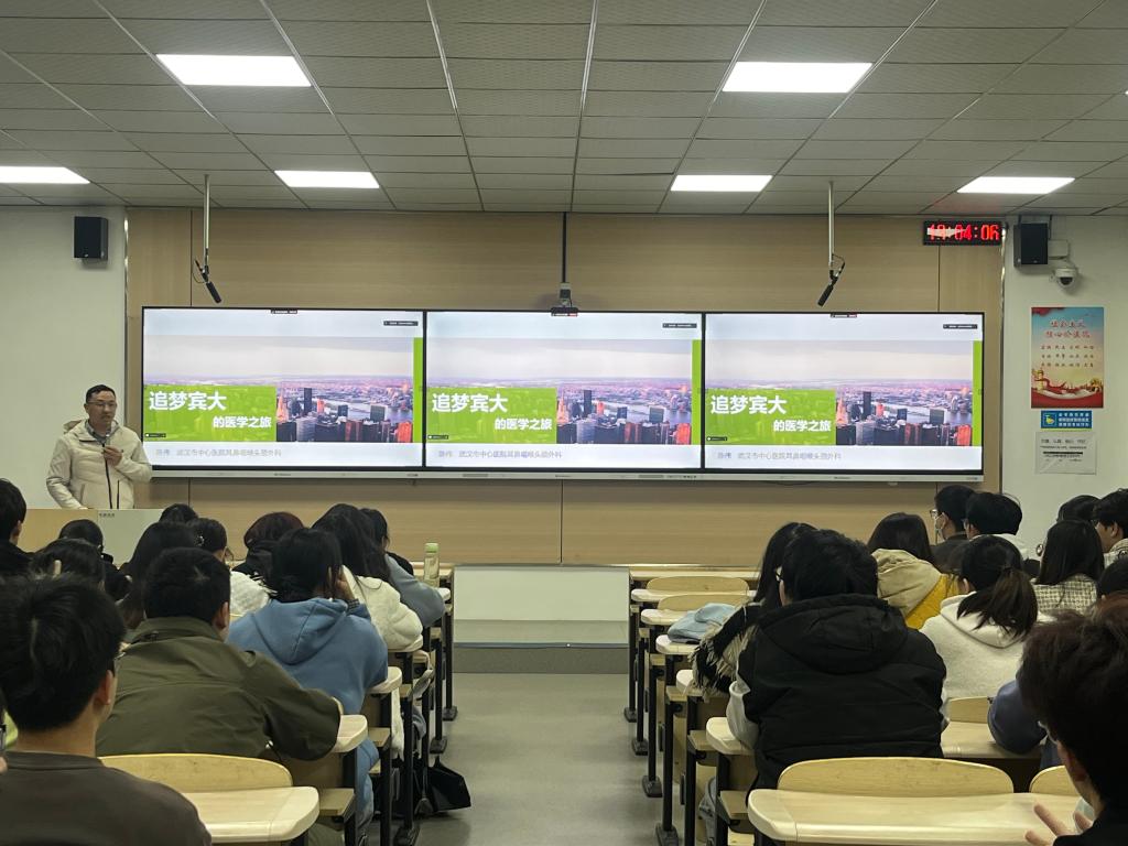 宣讲会上,武汉市中心医院陈伟主任以“追梦宾大的医学之路”为题,从中西方医学生的培养路径、培养模式等方面,向同学们展示了一名普通医学生的求学、科研、就业的进取之路,为同学们理清前行的路,激励着学生们潜沉钻研,刻苦求学。