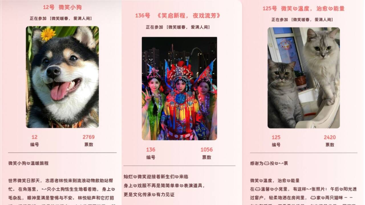 活动以“微笑为核心,设置线上故事分享与微笑展示环节,内容涵盖同学互助、师生互动、陌生人善意传递等真实场景。参与者通过图文、短视频等形式记录身边温暖瞬间,展现真诚微笑。活动期间,投稿作品累计超过200份,话题阅读量突破上千次,引发学生共鸣。通过线上投票,最终评选出20份“人气作品”,其中最高票数达3251票。不少学生表示,活动为情感宣泄提供了出口,帮助他们在忙碌学业中重新发现生活中的美好,更深刻理解了“微笑不仅是表情,更是积极的生活态度”。