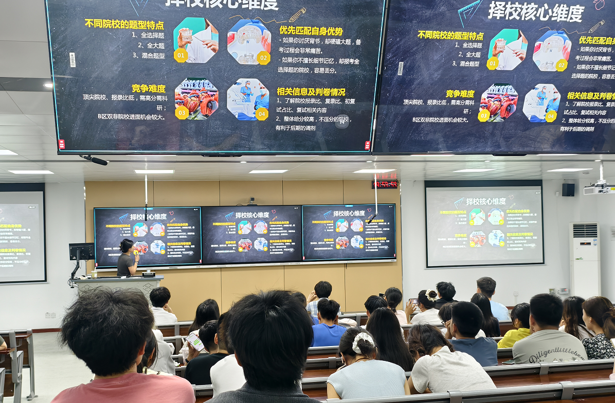 分享会上,五位主讲人结合自身上岸经历,围绕考研全流程展开深度解析。从备考和报名时间分布、如何利用碎片化时间学习、各科学习重难点分布、决战心态调节、择校技巧等方面进行深入剖析,现场氛围轻松愉悦,金句频出,幽默诙谐,以学生的视角探讨考研,为不同备考需求的同学提供了多元化解决方案。