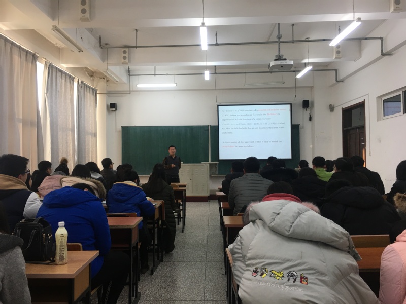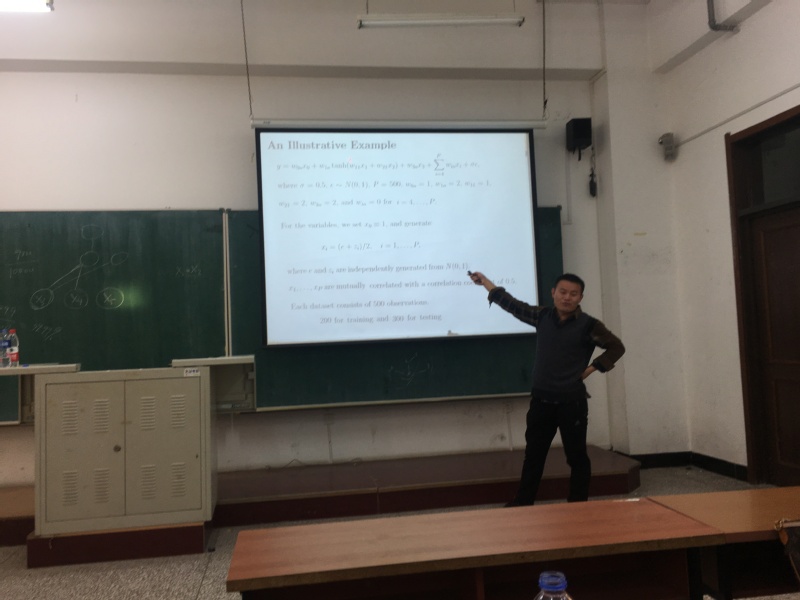 报告会中,李启寨老师结合自身多年的学习、教学和科研经验,从“生物标记”引出一个例子,介绍了两种变量选择方法:频率法和贝叶斯方法。接着,讲解了贝叶斯神经网络,用后验分布进行抽样,在理论的基础上,李老师给出了两个例子,用以说明理论的应用。最后,李老师对同学们提出的问题进行了详细的解答,也与学院里的老师进行了深入互动。
