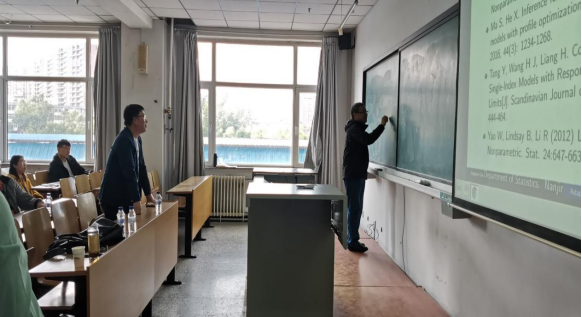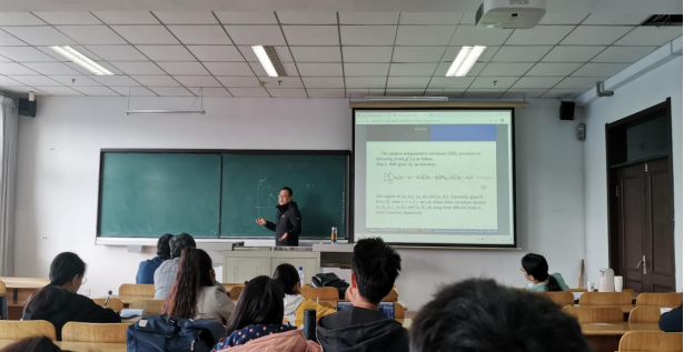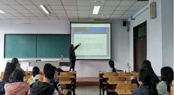 报告会中,林金官教授讲解了单指标模型,单指标模型是应用定量科学中最常用的半参数模型之一。教授讲解的论文研究了链接函数中存在未知跳转的单索引模型。提出了一种自适应半参数估计方法来估计指标系数和连接函数。在一些温和的条件下,在不指定误差分布的情况下,所得到的参数部分和非参数部分估计量的渐近正态性是可以建立的。在实际应用中,改进了EM算法,实现了自适应半参数估计。使大家对于改进的EM算法有了更加深入的了解和兴趣。