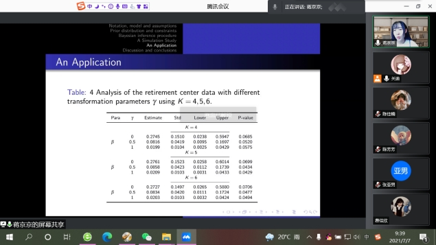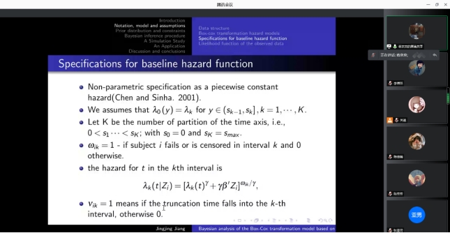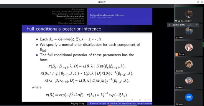 报告会中,蒋京京博士首先指出讨论Box-Cox转换模型的推理问题时面临left-truncated和right-censored数据, 比如横断面抽样方案。然后,指出Box-Cox转换模型包含了许多常用的模型,如比例风险模型和加性风险模型等特殊情况。随后,提出了一种贝叶斯估计方法,该方法采用分段函数逼近基线风险函数。同时,利用边缘部分不受约束的条件边缘先验来解决参数约束带来的计算难题,并提出了一种MCMC抽样方法。最后对所提方法进行了有限样本性能的仿真研究,结果表明该方法适用于实际情况。使大家对于Box-Cox算法及贝叶斯估计有了更加深入的了解和兴趣。