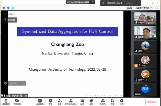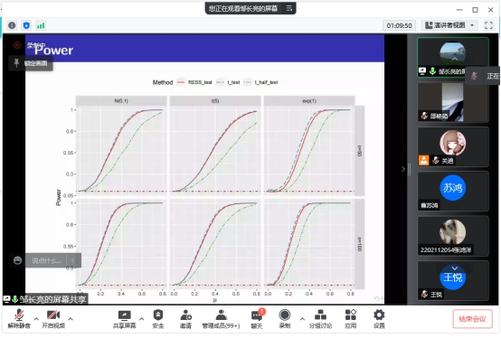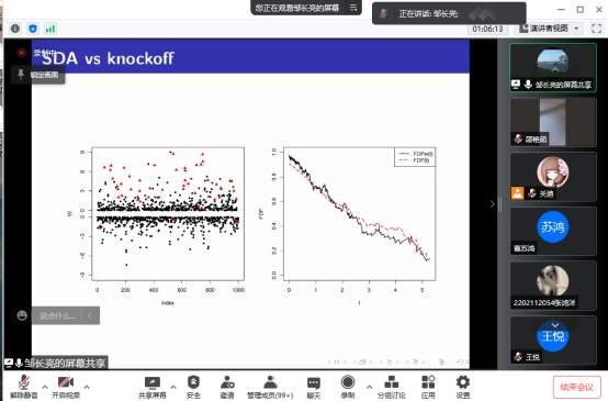 邹长亮教授通过一个简单的例子对SDA的具体实施步骤进行了细致的讲解,证明SDA方法比基于渐近p值的方法更具鲁棒性。报告会结束后,大家对基于一般依赖的错误发现率控制问题产生了浓厚的兴趣,老师及同学向邹长亮教授踊跃提问交流,其中李教授针对同学提出的如何将SDA方法扩展到FDP问题做出耐心解答,并进行了细致的阐述,拓展了老师和同学们表示在该方面得到了前所未有的启发,激发了同学们的学习热情,为接下来的科研工作积攒了宝贵经验,为我们接下来的工作开启了新思路。