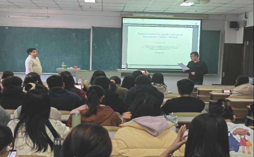 胡教授的报告方式新颖且深刻,既生动地向大家展示了贝叶斯的魅力,又通过讲相关方法的详细阐述,让大家对贝叶斯有了深刻的理解。报告会后,老师和同学表达了对该方向浓厚的兴趣,并提出相关疑问,胡教授也对我们的疑问做了详细的解答和建议。通过此次报告会,同学们对贝叶斯方向有了更明确的认知,既提高了同学们的学术水平,又让同学们大受启发。