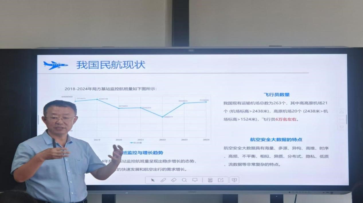 在报告中,张教授向同学们系统阐释了航空安全大数据领域的专业知识。航空安全大数据具有海量、多源、异构、高维、时序等复杂特点,涵盖飞行品质监控(QAR)数据、运控数据、气象数据、地理数据等多类信息。以QAR数据为例,其完整记录了飞机飞行阶段的各项参数,每天的数据存储量超过4TB,对存储和计算能力提出了极高要求。此外,数据在采集、传输和译码过程中还存在缺失、失真等问题,亟需高效的数据处理和分析技术。