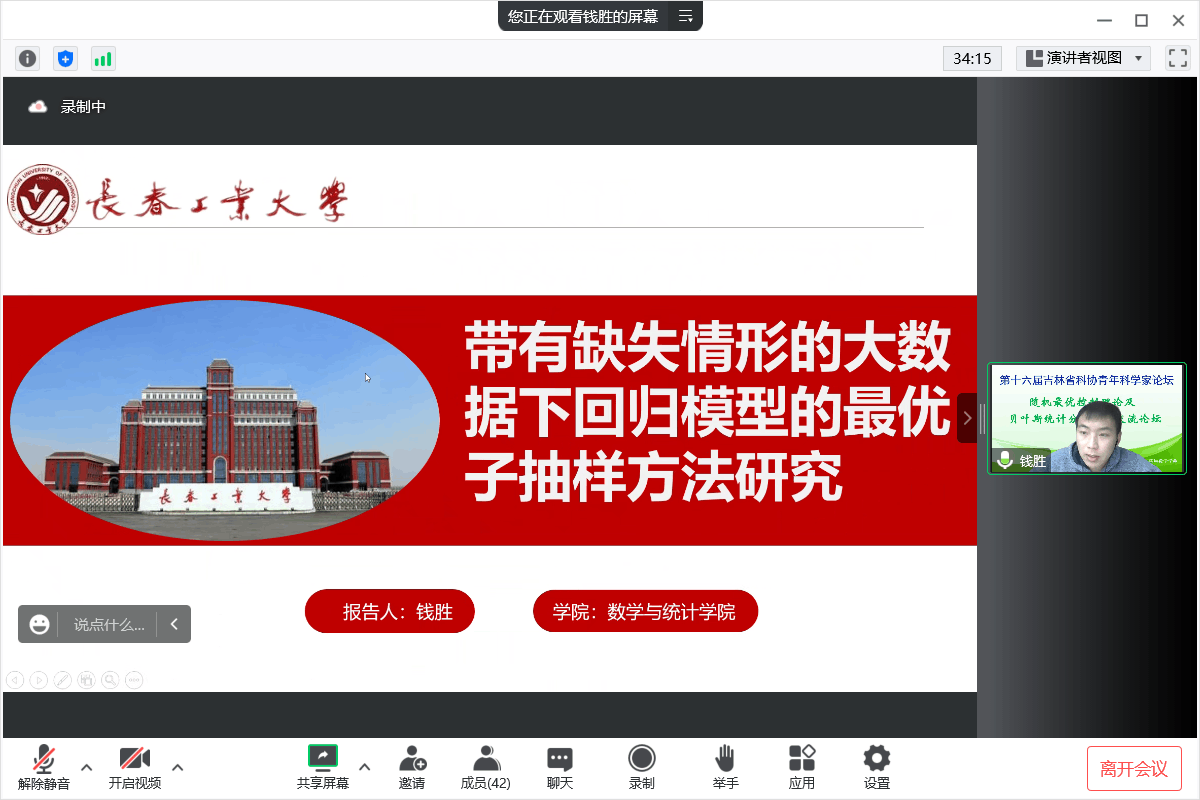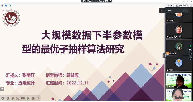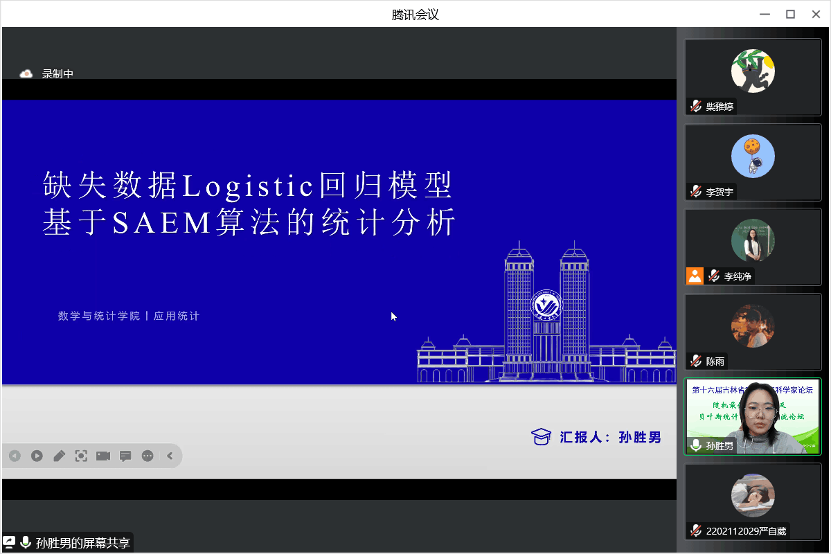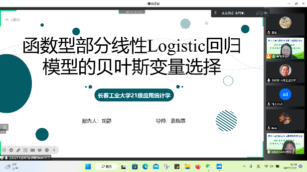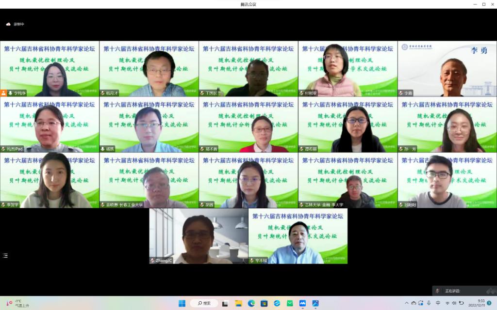 【通讯员 胡茜】2022年12月11日,上午9:30,由吉林省工业与应用数学学会主办,澳门十大信誉好的网站协办的“第十六届吉林省科协青年科学家论坛-随机最优控制及贝叶斯统计分析析学术交流论坛”在腾讯会议线上举行。主论坛特别邀请吉林省工业与应用数学学会李勇理事长、东北师范大学郑术蓉教授、吉林大学韩月才教授、吉林大学辛本禄教授、暨南大学王国长教授、北华大学谭希丽教授、吉林大学李天宇副教授、西安交通大学付利亚副教授、闽南师范大学吕阳阳老师、北华大学张继超老师。本次论坛由学院副院长李纯净主持,学院院长王纯杰、统计系主任杨凯、统计系党支部书记袁晓惠、统计系教师孙一芳、李贺宇、胡茜以及部分研究生参加了本次线上青年科学家论坛。