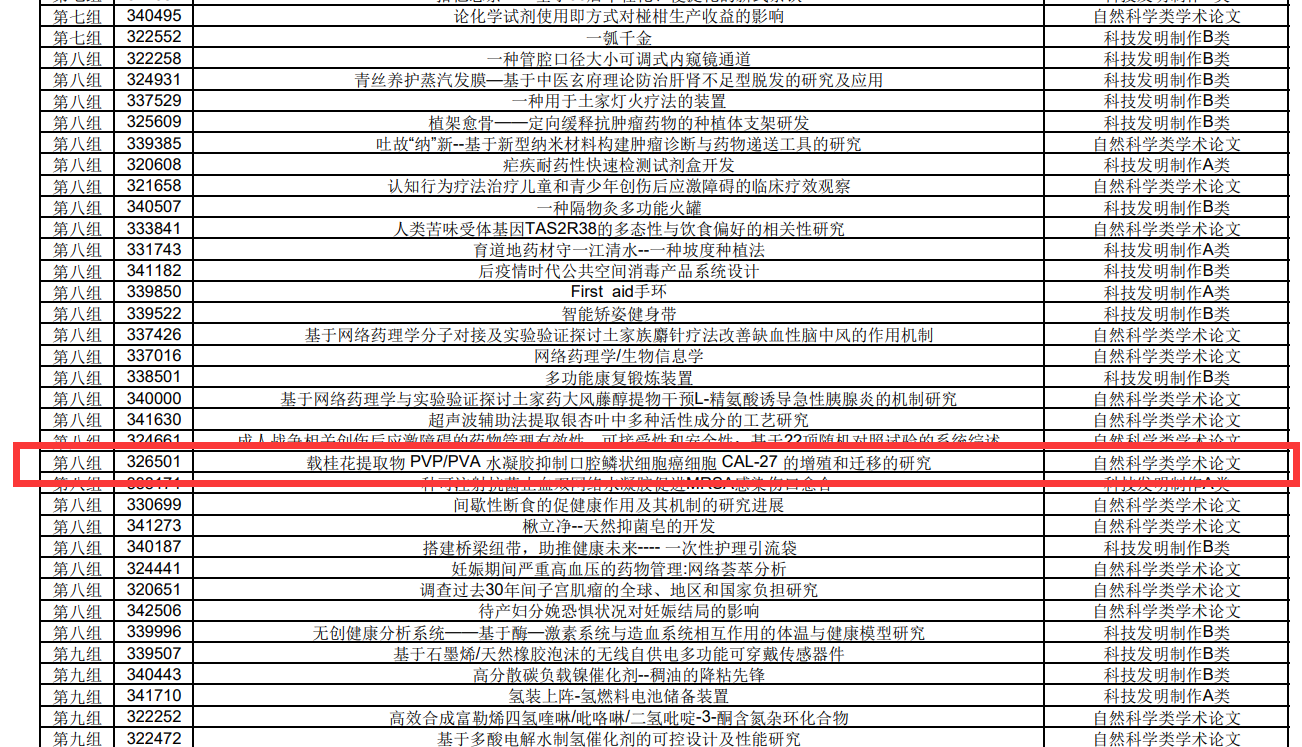 (通讯员 陈黄琴)近日,我省第十四届全国大学生课外学术科技作品竞赛落下帷幕。我院吴池洲等同学撰写的自然科学类学术论文《载桂花提取物PVP/PVA水凝胶抑制口腔鳞状细胞癌细胞CAL-27的增殖和迁移的研究》获得省级三等奖(指导老师:陈黄琴,黄彬)。