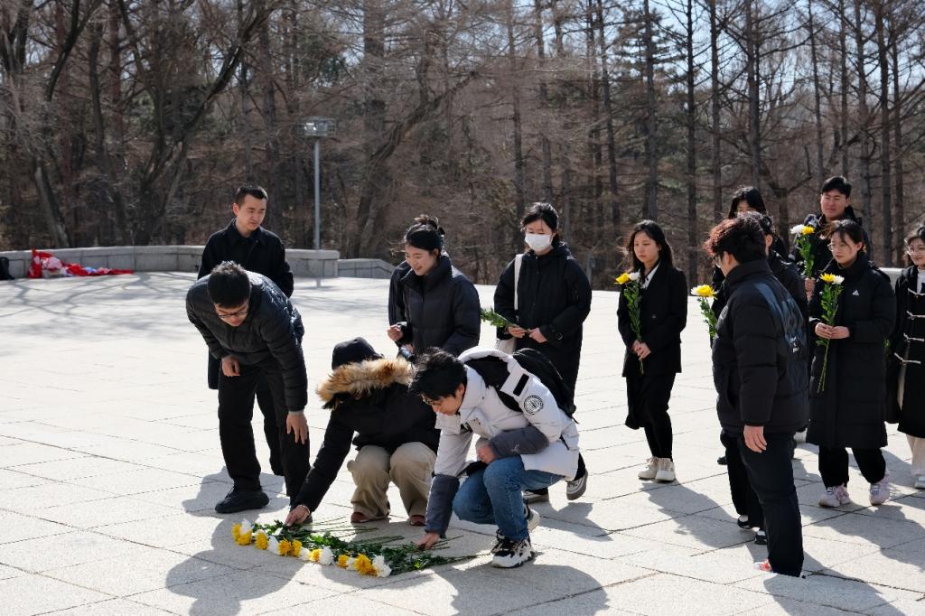 在庄严的长春解放纪念碑前,大家整齐列队,手持菊花,向在争取民族独立和解放过程中献出生命的英烈表达深切哀思和崇高敬意。