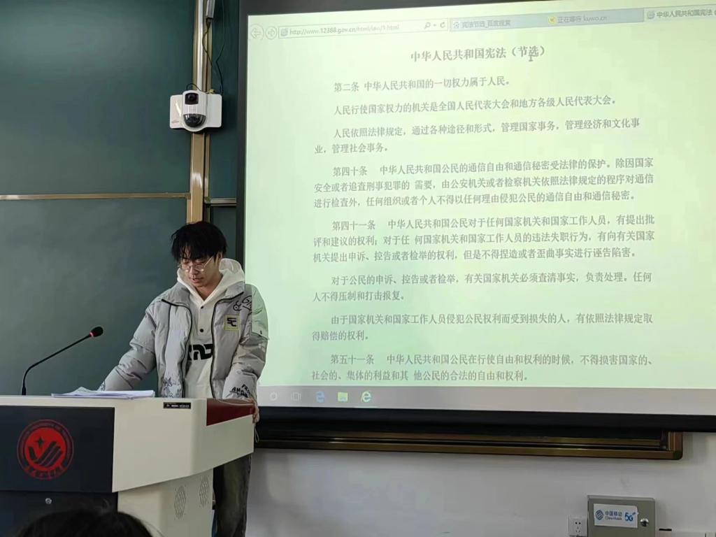 活动中,林利桁同学向全体人员宣读《中华人民共和国宪法》(节选)并让全员跟读。他指出,作为团学干部应自觉了解并学习宪法,积极成为宪法知识的宣传者,宪法严格遵守者。人民日报提出“宪法是国家的基石,遵守宪法是公民道德的基石。”团学干部应强化责任担当,带领各班组织宪法主题班会,让同学更多的了解宪法知识,通过系列宣传活动,让学生增强法律意识,自觉用宪法规范自己的行为,学习宪法、宣传宪法,深刻理解宪法的基本原则和精神。最后林利桁同学带领全体团学成员认真学唱《宪法伴我们成长》这首歌,正如歌词所写“求学受教,守土护疆,宪法为我们护航”,通过朗朗上口的歌词不仅渗透了宪法知识,而且激发了同学们对学习宪法的热情以及对宪法的敬意。