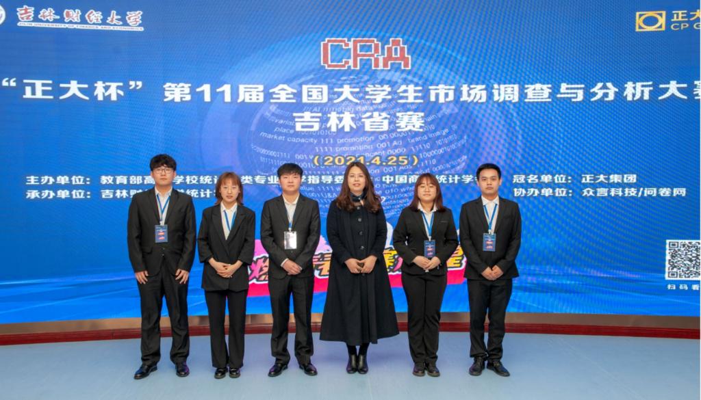 在2020年4月25日,“正大杯”第十一届全国大学生市场调查与分析大赛本科组吉林省赛决赛在吉林财经大学成功举办。通过国家网考、校赛、省初赛等一系列激烈角逐,由邰志艳老师、刘铭老师指导的2018级统计学专业郭祥道、卢思雨、王畅、马凯乐、2018级信息与计算科学专业闫新洋组建的林海雪原队进入最后一轮省赛决赛,获得本次大赛第六名的好成绩;由李纯净老师、胡茜老师、邰志艳老师指导的2019级信息与计算科学专业茆欣意、2019级统计学专业陈彦江、张伯宁、2018级统计学专业张伯宁、韩春峰组建的五个和尚队获得本次大赛的第十名,两支队伍最终获得国家级三等奖,十大信誉另外两只队伍分获吉林省一等奖和二等奖。