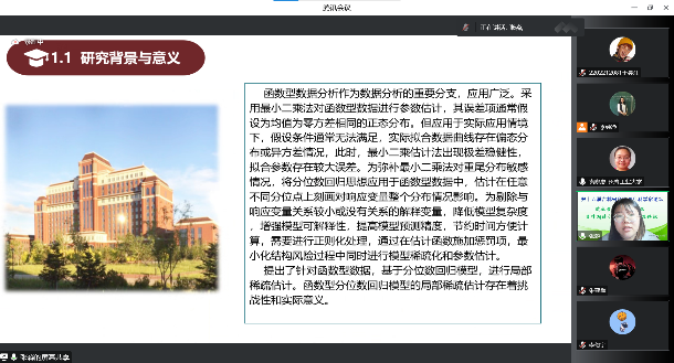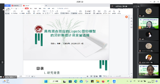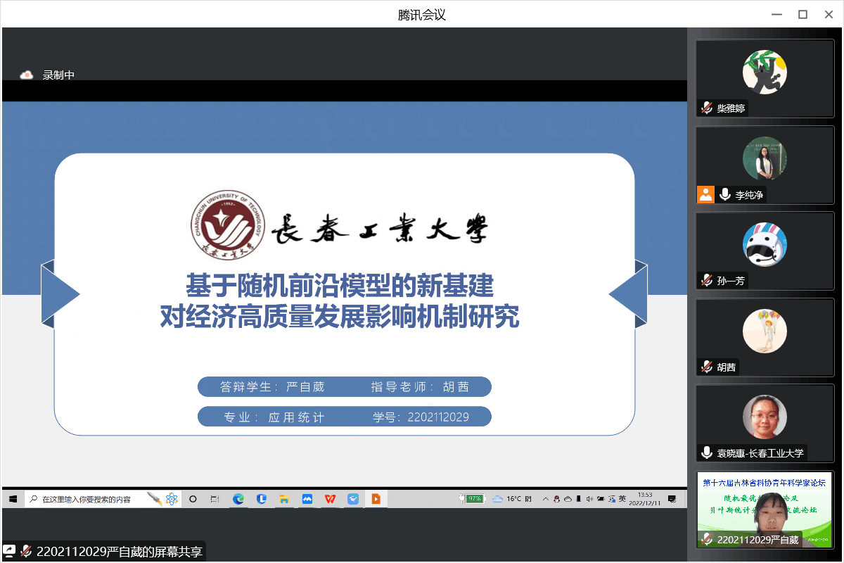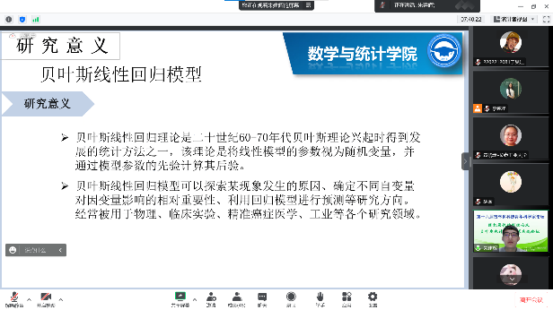 【通讯员 胡茜】20221211日,上午9:30,由吉林省工业与应用数学学会主办,澳门十大信誉好的网站协办的第十六届吉林省科协青年科学家论坛-随机最优控制及贝叶斯统计分析析学术交流论坛”在腾讯会议线上举行。主论坛特别邀请吉林省工业与应用数学学会李勇理事长、东北师范大学郑术蓉教授、吉林大学韩月才教授、吉林大学辛本禄教授、暨南大学王国长教授、北华大学谭希丽教授、吉林大学李天宇副教授、西安交通大学付利亚副教授、闽南师范大学吕阳阳老师、北华大学张继超老师。本次论坛由学院副院长李纯净主持,学院院长王纯杰、统计系主任杨凯、统计系党支部书记袁晓惠、统计系教师孙一芳、李贺宇、胡茜以及部分研究生参加了本次线上青年科学家论坛。