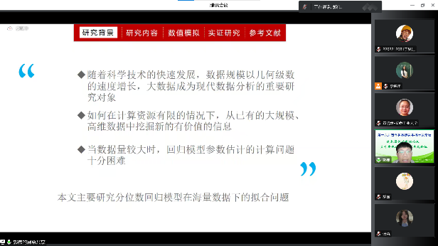 主论坛上,李勇理事长代表学会对论坛的举办表示由衷祝贺,高度评价了澳门十大信誉好的网站近年来快速发展的良好态势,表达了学会对本次论坛的大力支持和高度重视。在各位青年学者进行汇报之前,各位专家开展了热烈讨论交流并进行云合影。分论坛共邀请了23位青年学者进行学术报告,报告分为3个专题,汇报的研究方向有函数型数据研究、贝叶斯统计分析、其他模型与算法的研究等。青年学者积极开展学术报告,各位与会专家、学院院长王纯杰和统计系主任杨凯分别为青年学者进行点评。