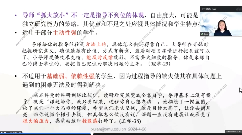 2. 灵活指导:博士生培养模式改革可能为打破传统的单一导师指导带来新的机会。例如实验室轮转制度,协同创新人才培养平台,以及博士生中期考核设立的考核指导小组等,都促进了博士生与多位导师的交流。有助于打破“博士生是导师的私人财产”思维,拓宽视野,培养创新能力。