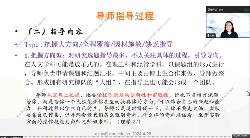 6. 因材施教型:有弹性,根据学生的特点调整指导内容。这个要求也相当高,需要导师不断学习,追踪前沿问题、阅读文献和拓展自身能力。